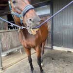 サーチ:「僕の競走馬時代、最後の2戦は障害競走に出たんだよ。だから、障害なんて怖くないんだ!競馬の障害とは乗馬は違うけど。現役時代は未勝利で5着、8着の成績で、次回は得意の東京での出走予定だったけど、調教中に屈腱炎になって引退し、イグレットに来たんだ。下の写真は初回の障害競走を終えたところなんだ。泥だらけになったけど、気にしないよ。」