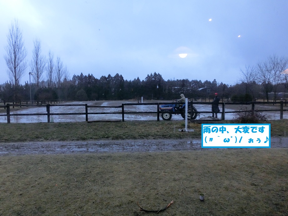 私たちが暖かなクラブハウスでお話をしている間、イグレットのスタッフのTさんたちが、雨で水たまり状態になった馬場の水を側溝に流していました。